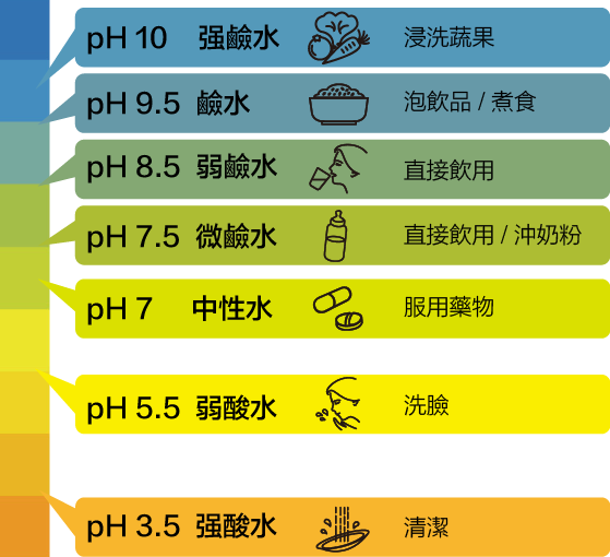 BionTech 電解水機提供 6 個級別的酸/鹼性用水以及中性(pH 7)的用水。適合日常生活上不同用途,當中酸性使用水 pH 3.5 和 pH 5.5 可分別作洗臉及清潔之用。而 4 個級別的鹼性水 pH 7.5、pH 8.5、pH 9.5 和 pH 10,則可分別用於直接飲用,煮食以及浸洗蔬果的用途。想了解更多可參考「適合用途」。