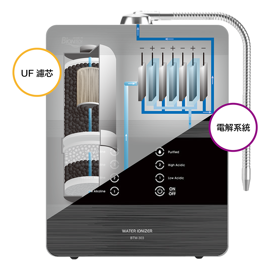 BionTech電解水是經由過濾系統及電解系統所產生的。首先自來水會進入BionTech的「0.1微米」特效過濾系統,把水中的重金屬如鉛等,病菌及有毒化合物除去。變成純淨水後便會進入電解系統進行電解,完成後便產生帶鹼性或酸性的電解水。